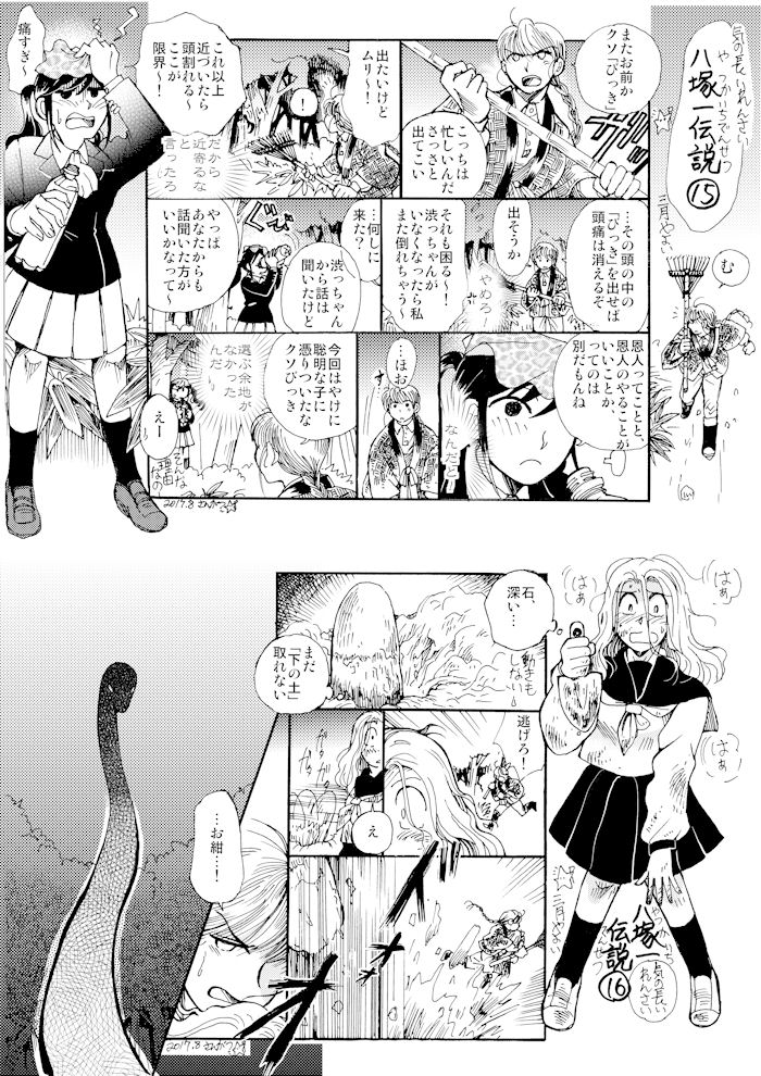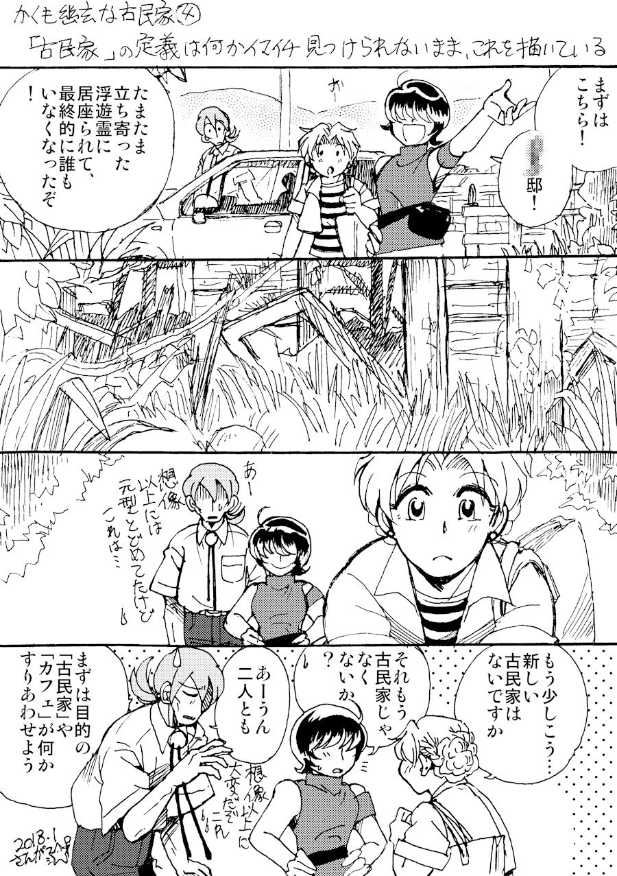 マンガハックやブログ掲載分から色々状況が違ってるので解説すると、一コマ目のは青瀬の古い友人・一弘。幽玄さんと一緒にいるのは、一会町ではない場所で青瀬が請け負ってる仕事を手伝ってる大学生たちと、その会場に棲んでるお化けたちです。幽玄さんは一弘に何度か会ったことがあります(まだ描けてないだけ)。