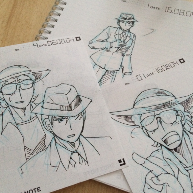 今回、どの絵も例によってプラチナの万年筆・preppy0.2で描いてますが、ノート版だと線が滲みやすく、裏面にもちょっと出ます。メモ版は余裕で両面使えました。