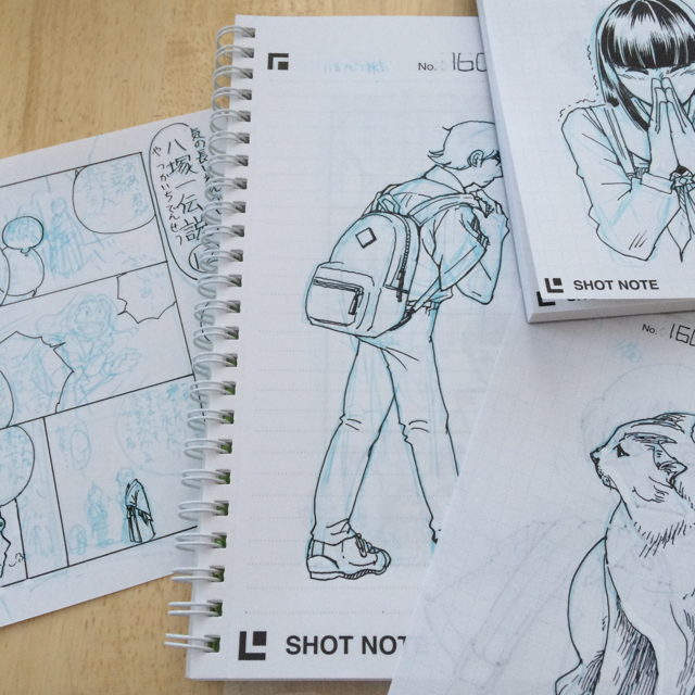 ↑スマホ取り込み用漫画カットと、描き途中の「八塚一伝説」原稿。