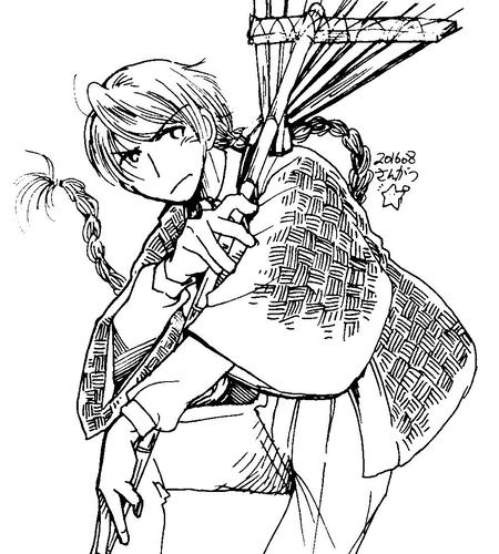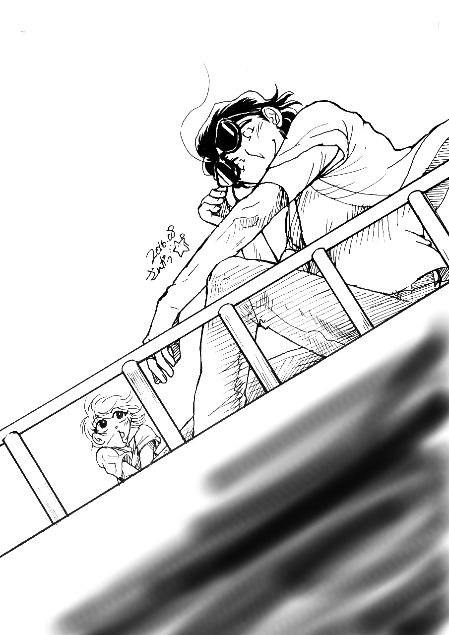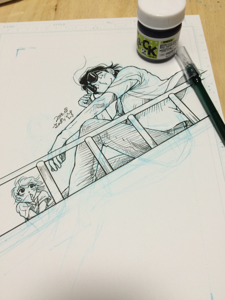 ↑今度は原稿用紙に描いてみた師匠とかりん。手前の柵は筆ペン、先の方の下部はスマホ加工。