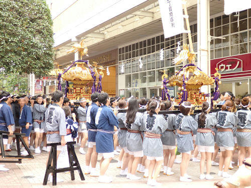 アーケードとアーケードの間の横断歩道で、向こうから御神輿の一団が来ていたのです。