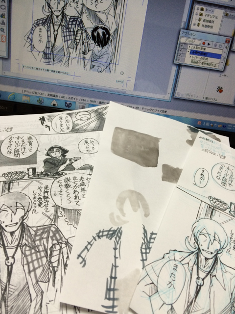 A4コピー紙を半分に切ったものに万年筆でザカザカ描いてます。普段はベタもなんも全部描いて、スマホで写メしてアップするんですが、今回はちょっと別の仕上げを試してみました。