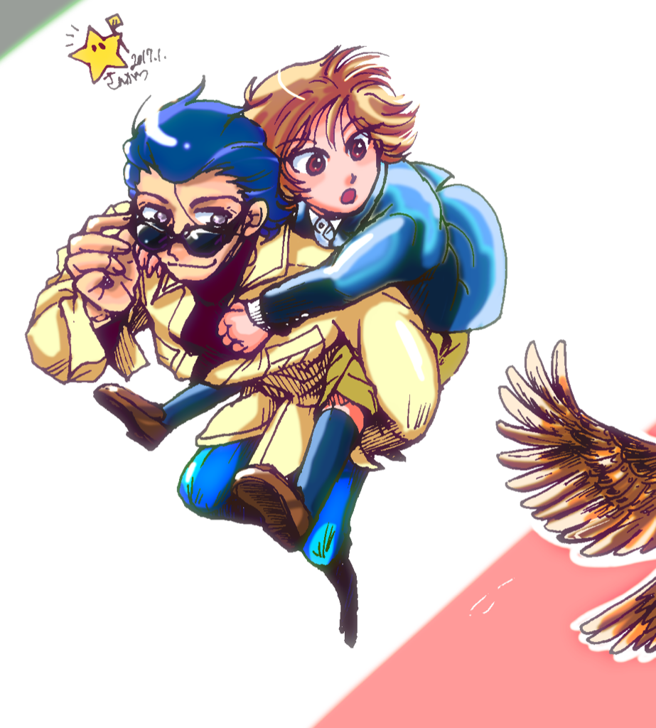 「モザイクの魔術師」のゼンダ師匠とかりんです。酉年なんで飛んでる絵にしたかったんですが、切り取ったらあんまり飛翔感なくなっちゃいました(汗)。