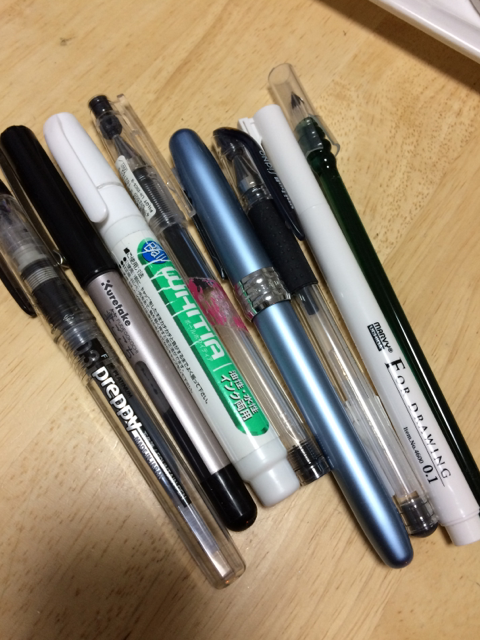 相変わらず、ちょっとした時間でもすぐ描ける筆記具を探してるわけですが、とうとう顔料ボールペンやミリペンに手を出してますよ。どれも一長一短ですねえ。