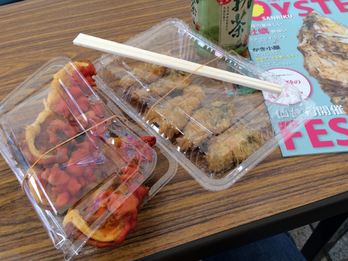 私は蒸しホヤも食す。珍しくワインがほしいと思ったけど、日本酒(豊富にあった)とビールしか見つからず。うむむ、日本酒は私には強すぎるしビールは寒い(天気はよかったが風が寒かった)。悩んだ結果、お茶で食べる。うむ、うまい。ホヤは写真ではわかりにくいけど、かなりデカい。