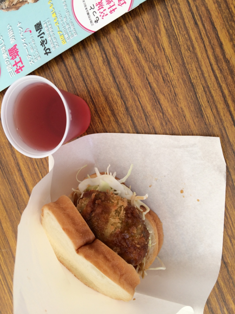 もう少しなんか食べるかね、とふらついて、カキクリームコロッケバーガーを食べることに。