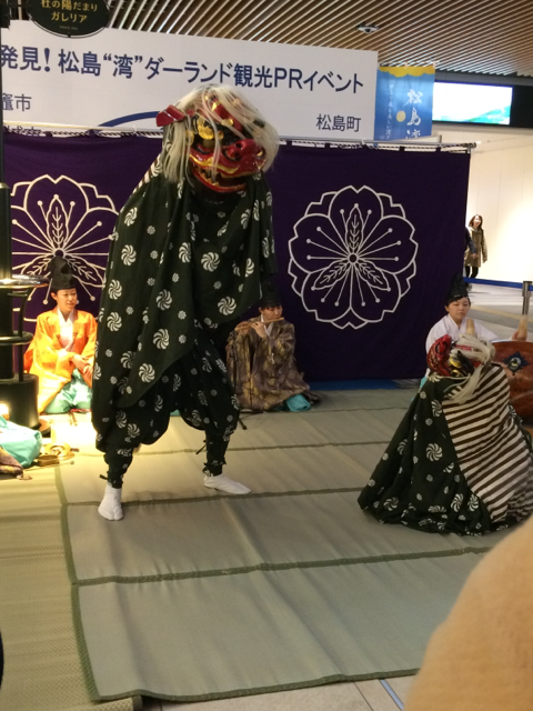 最初の解説と、会場で地味に配られてたパンフレットによると、塩竃神楽は大きく二つに分かれてまして、伊勢太神楽の系統と、十二座神楽(全12曲の神楽をやる)の系統の混合なのだそう。今回行われるのは「塩竃太神楽」のなかの「親子獅子」。伊勢の系列の神楽ですね。平たく言うと獅子舞です。