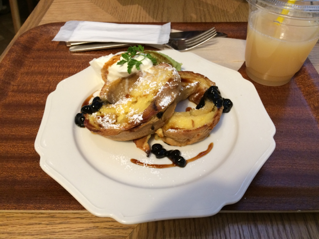 車麩という、ちょっとデカめのお麩の一種で作られたフレンチトースト(麩レンチトースト)です。写真角度で、ずんだ餡が隠れてしまいました…黒いのは黒豆です。
