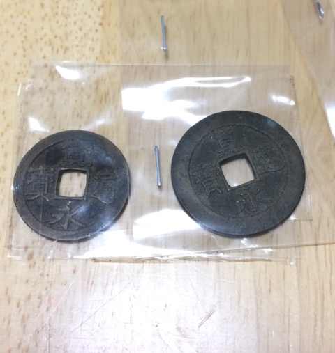 ↑なぜかセール売りしてたので、ふと買ってみた寛永通宝。一文銭と四文銭です。