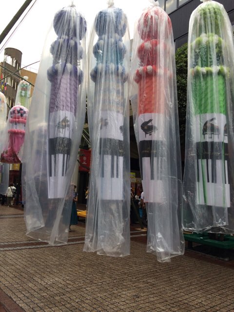 (↓こんな感じ。手前のカワイ楽器の吹き流しはちゃんと絵が見えるようにされてますが、大部分は後ろにチラッと写ってるように、下部のヒラヒラが縮んだ状態にされてしまいます。どちらも、昨日旦那と行ってきたときの写真。その時は降ったりやんだりだった)
