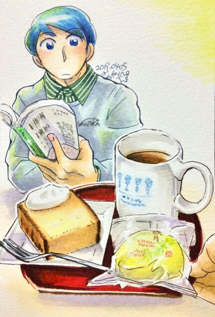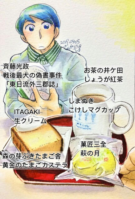 実は、地味に宮城のメーカーで固めたメニューでした(本は、たまたま自分が読んでた本です)。カステラはうまく描けた気がする。萩の月は簡易包装版です(普通は箱入り)。