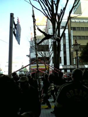 自分が見ている間に3人、入れ替わり技を披露して(ちょうどハシゴの上が駅の連絡通路と同じ高さだったらしく、3人目の鳶さんは飴を2階にまいてました)お開き。