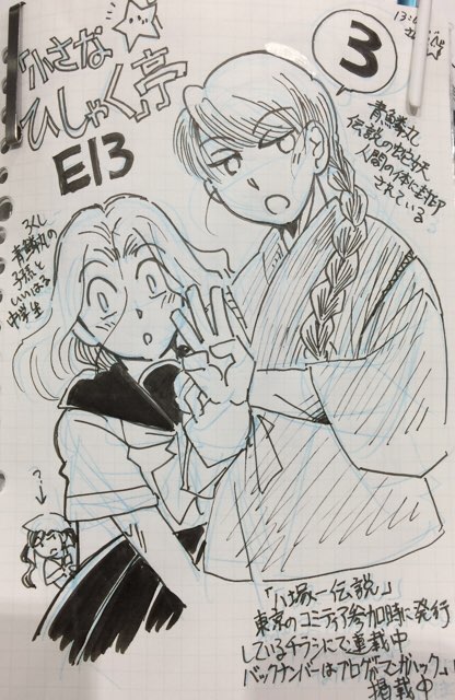 「八塚一伝説」の玉環と中学生(ろくし、という名前があるんですが、まだ本編でだしてませんでしたねそういえば)です。A5の紙に下書きも消さずに描いてるというのに、だいたい1時間に1枚ペースです。こういうチャレンジをするには手が遅すぎた気もします。