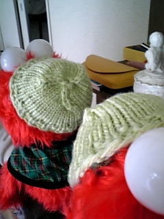 自分のはもっと簡単なので作ってたし、旦那はこっち来てから帽子使うほど寒いことないそうなので、エルモ人形に毛糸の帽子を作ってみました。チェックの帽子の上から無理やりかぶせてます。
