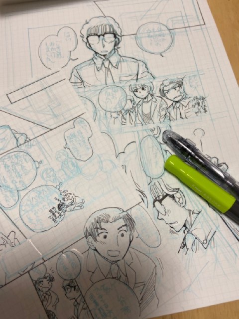 ↑写真は、狩谷さん7の2原稿に出てくる新キャラがどうにもつかめないのと、その結果新刊に間に合わないのとで、取り急ぎ描き始めたショート(大きい方)と、7の1を描いてたあたりに斉田先生のキャラをつかむために途中まで描いたミニ漫画(小さい方)の原稿です。どちらも万年筆で描いてます。