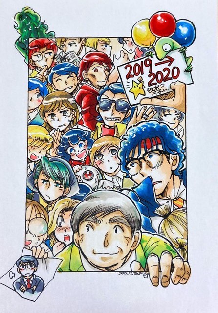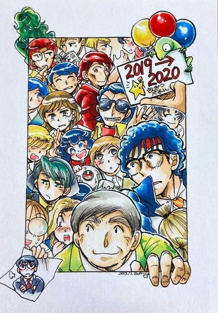 去年→今年の年またぎ絵をコピー紙にインクジェット出力したものに彩色したものです(線画の画材は不問です)。