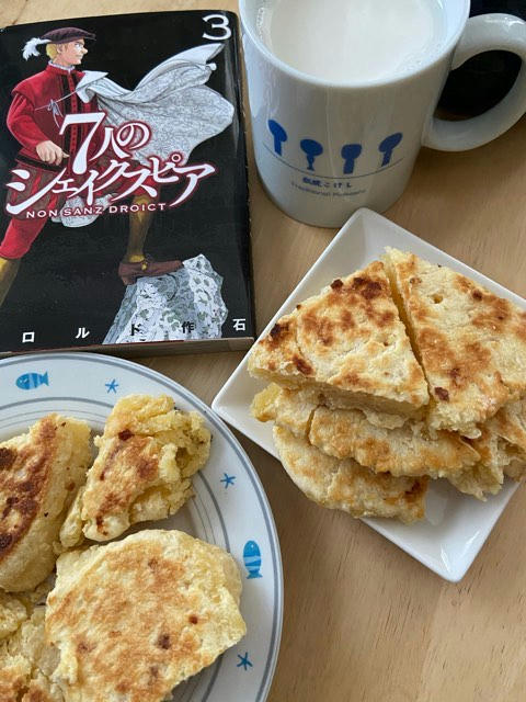 ↑最近、旦那と牛乳かんとかプリンとか作ってる我が家ですが、今日はひとりで、写真に載ってる「7人のシェイクスピア」という漫画に出てくるスコーンを作ってみました(本の中にレシピが載ってた)。本当はもっとピザ的な形のを切った感じになるはずでした…。