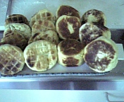 ガスコンロなので、コンロの○のあたりに置くと焦げやすいけど早く焼けます。10分くらい。こまめに返します(本当にせんべいみたい)。