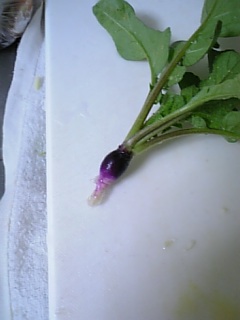 一番最初に芽を出したラデッシュが割れてきたっぽいので、早い気もしたけど収穫する。