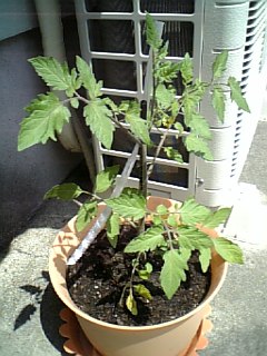 トマト、おお、ありがとうです。良く見たら、伸びた先に花の2段目らしきものが出来てきてました。支柱もつけましたが、そういえばまた伸びてるなあ。成長早いですね。