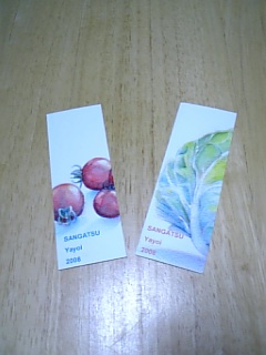 厚手の光沢紙の表に、自分で描いたミニトマトとキャベツをあしらってみました。