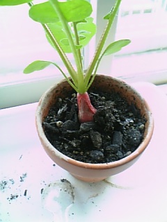 ミニ鉢に植えたラデッシュ。芽が出た後、間引いて一本にしました。
