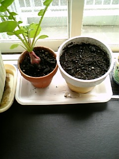 ラデッシュの隣に、ツタのお下がり鉢で。