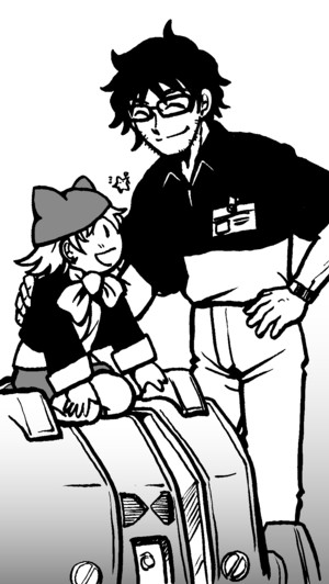 アカツキインダストリーの星野社長と娘のかえで、そしてトライヘッド(下手で申し訳ないのですが、一応初登場時の型で描いてみました)。