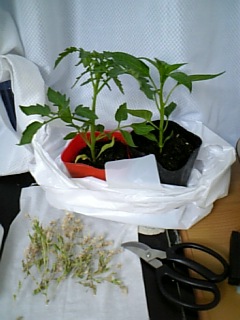 赤いポットはミニトマト(ピコ)黒いポットはピーマン(…としか書いてなかったため、品種名は謎)です。