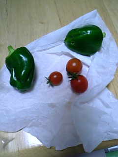 その、とんでもない雨風の前に、少々早めに収穫してしまったミニトマトとピーマン。