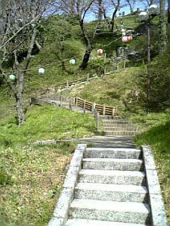 この階段を登ったところに、桜やツツジなどのほか、小さい遊園地があります。どんだけ上ですか!