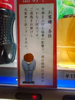 が、写真ボケボケだったので、代わりに帰りに見た自販機のお詫びPOPです。最近暑かったからなあ。