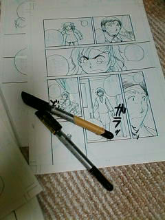 タチカワの新ペン先、苦労してカートリッジ取り替えてじきに、細い線がぜんぜん描けなくなった…しょうがないので古いほう(ガムテープ巻いてあるほう)はアップのコマとか背景の主線に使い、アップでの顔の中や引きのコマとかを新しいほうで描くという事態に…めんどくさいが、ペン先いちいち洗ったりふいたりそれでも錆びるのに比べたら早いかちくしょう。