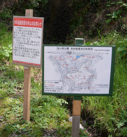 見えにくいですが、園内各地の放射線量と、遊戯施設休止のお知らせ。