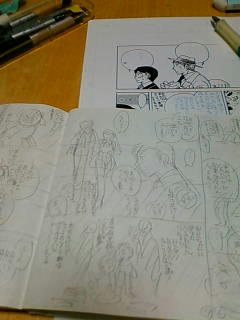↑某所の締切過ぎてるけど描いてるパロディ原稿と、光る空や轟音や時々一瞬停電するので落ち着かず、狩谷さんの原稿もあきらめて、別漫画のネーム描いていたもの。