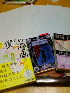 よく見えないですが、下書き原稿3種+最近読んだ本3種。