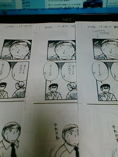 写真ではわかりにくいですが、閾値変えたり線幅を細くする処理してみたり、グラデーショントーンをはがしてデジタルでトーン処理してみたり…うーん、普通のトーンならあんまり気にならない(あくまで私は。ほかの人はどうか知らん)程度なんですが、グラデーションがどうも今一つ…でも使用箇所が多いから、これ全部外してとかも難しいし、なによりアナログ原稿自体はなるべくこのままにしておきたい。