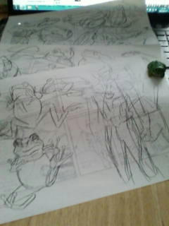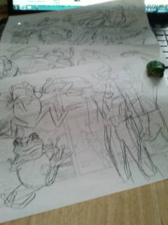 手前の紙になんとなく描いてあるのは、気分転換に描こうとしたら当然カエル以上に難しくて挫折したダルライザー(福島県白河市のご当地ヒーロー。公式サイトhttp://www.dharuriser.com/top.html)。