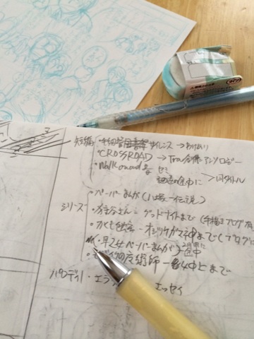 水色シャーペンで描いてるのは、来年のコミティア111チラシ用のミニ漫画下書き。