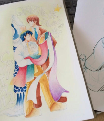 最初、水彩色鉛筆で塗って、暇を見て筆で色を溶かしてたんですが、普通に塗った方がやっぱり早いね…(当たり前)。水彩色鉛筆の色だけなら結構ビビットでいいなとは思ったのですが。