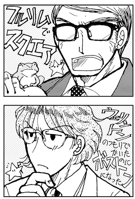 形だけならエム(下の人)がかけてる眼鏡が一番描きやすい。どうもボストンらしい(あやふや)。