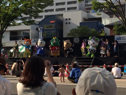 仙台すずめ踊り会場で、宮城のゆるキャラのステージから。みんなで決めポーズしてるとこ。