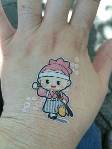 悲しいかな、かんばせにひびが入ってしまいましたが(ごめんよ…)八重たんのタトゥシール。福島ブースでやってました。旦那がいなかったら自分はチャレンジしなかったかも…貴重な経験でした。貼るときの手の形も大事なんだなあと。