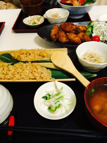 私はウニの炊き込みごはん。旦那はありがとう漬け丼。そしてカキフライ。豪華!