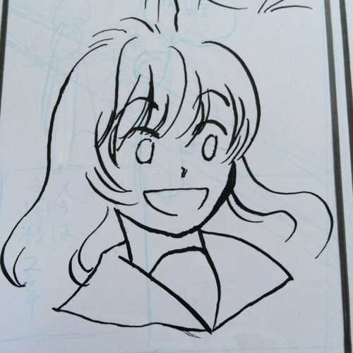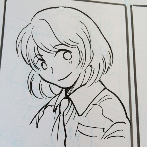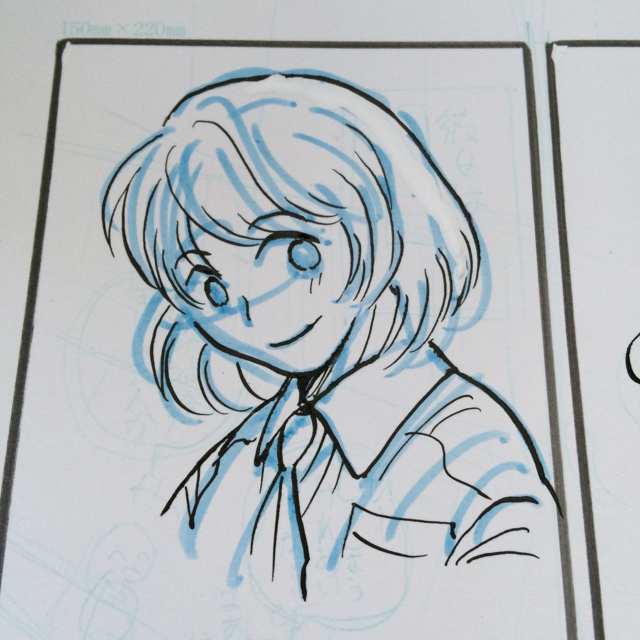 なんか下にうっすらみえてたり、横に枠線が見えてたりしますが、これ実は前にアンソロジーに投稿した漫画の原稿です。時間が無くなりすぎて、ペン入れ途中な画像と下書き画像をそれぞれスキャンして残りをデジタルで描く、という無茶な原稿の仕上げ方をしたので、中途半端な原稿がたくさん残りました。なので試し描きや小さいカットなんか描くときに使っているのです。
