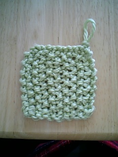 ゆがみや丸まりが少ないという、カンタン鹿の子編み(奇数分作り目をして、表・裏・表・裏…表をひたすら繰り返す)で作ってみました。編み目はカワイイけど、タワシにしてはスカスカだったかも(汗)。